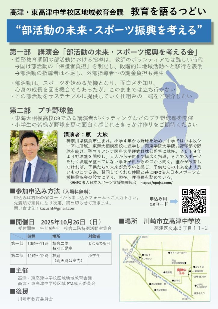 今回は東海大相模高校OBの原大地さんを講師にお招きし、「部活動の未来・スポーツ振興を考える」をテーマに、講演会やプチ野球塾を開催する予定です。是非この機会にスポーツの面白さを知り、心身の成長に繋げる機会としてください。
